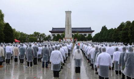 鲜花献英灵,雨中慰先烈。青松翠柏掩映下的烈士陵园庄严肃穆,刻有“人民英雄永垂不朽”八个大字的革命烈士纪念碑巍峨耸立。参加活动的各界代表冒着沥沥细雨在烈士纪念碑前整齐列队、庄严肃立,深切缅怀革命先烈。