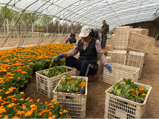 良王庄乡陆家村正响花卉种植中心的大棚,一片生机盎然,满棚颜色鲜艳、娇艳欲滴的花卉与棚外的蓝天、绿树相映成趣。工人们正在加紧装箱,准备送往客户手中。