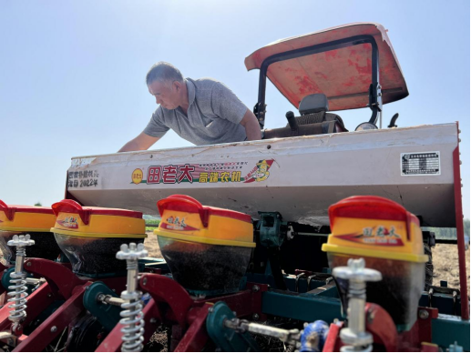一台玉米一体化播种机正穿梭在田地里,工作人员将玉米种子和肥料倒入自动播种机内,随着机器来回旋转,几分钟便能完成一亩地的玉米播种和施肥。