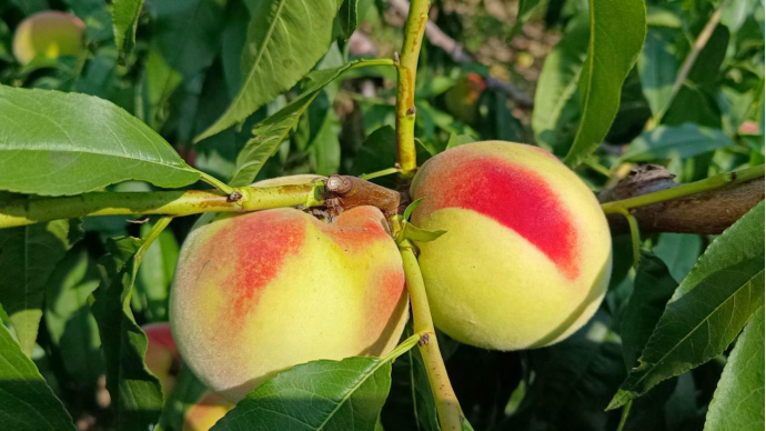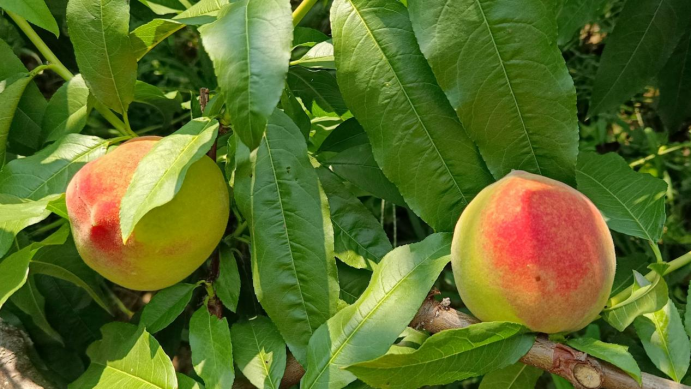 茂密的枝叶间,一个个饱满水嫩的北京14号桃果挂满枝头。