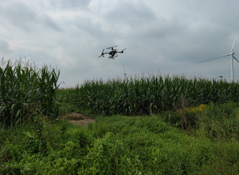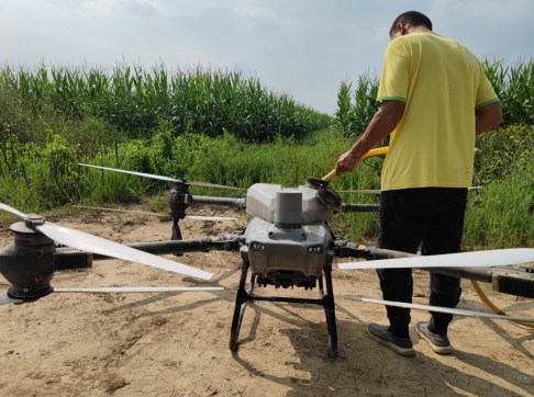 防治现场,工作人员将按配比调配的防治药剂装入无人机药箱,在技术人员的操控下,无人机稳稳起飞。伴随着阵阵轰鸣声,无人机按照设定的工作路线飞入喷洒区域来回飞动,防治药剂被精准、均匀地喷洒到每一株玉米植株上,不到一天的时间,无人机就完成了2000余亩玉米病虫害防治作业。