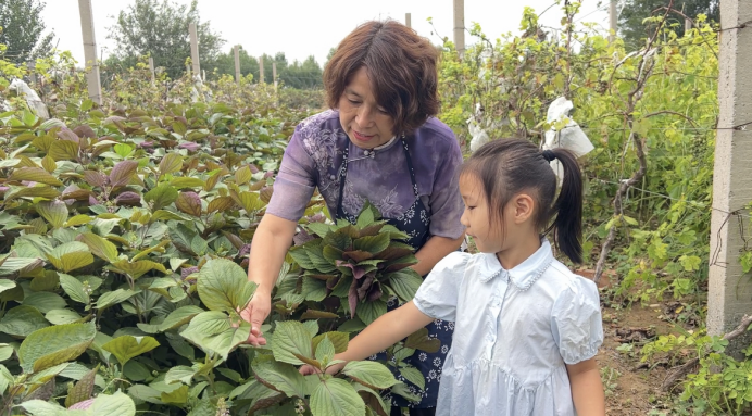 在紫苏种植园里,几名市民正带着孩子亲手采摘紫苏叶。翠绿的紫苏叶带着特殊的香气,被整齐放置在竹篮里。嬉笑声、欢闹声与种植园内的果实芬芳交织在一起,在阳光和煦的微风里飘散。
