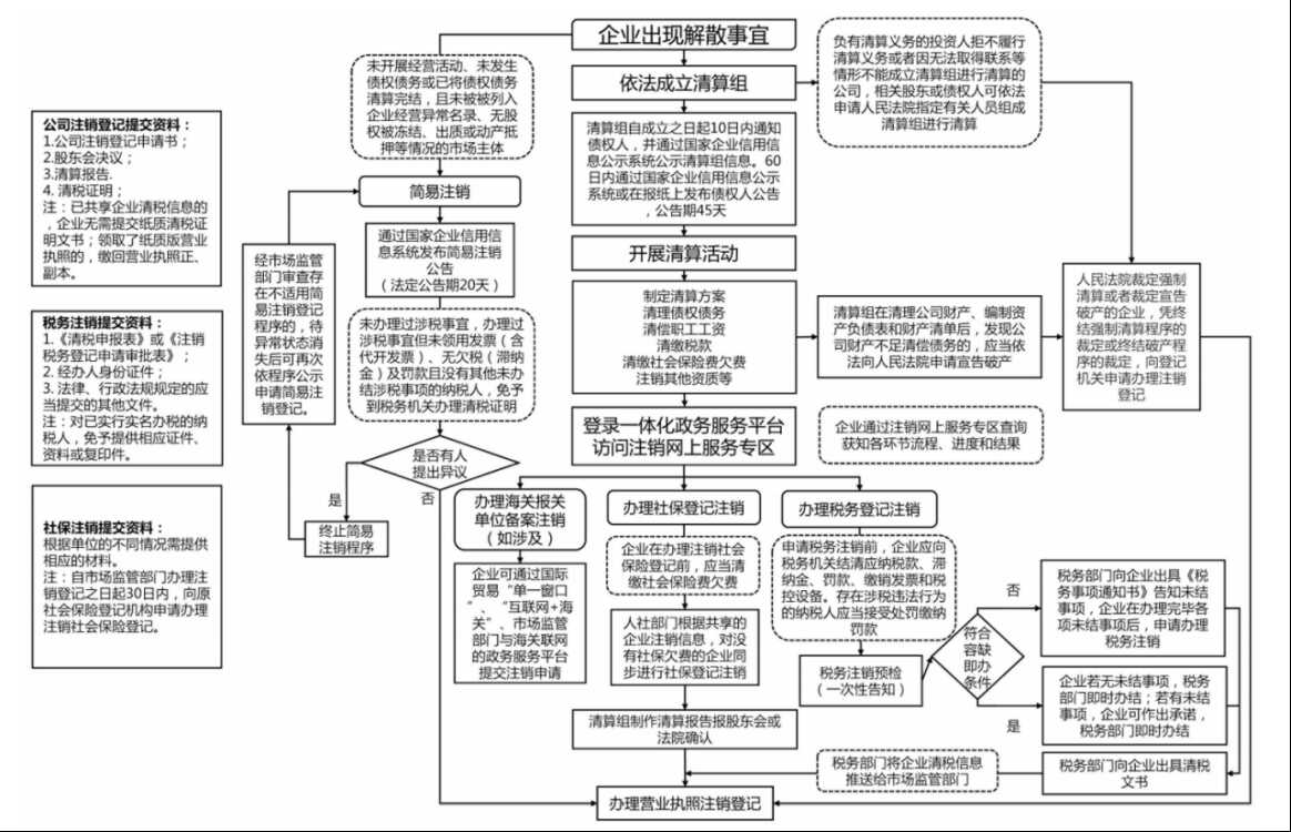 通常情况下,企业终止经营活动退出市场,需要经历决议解散、清算分配和注销登记三个主要过程。以公司为例,按照《公司法》规定,公司在退出市场正式终止前,须依法宣告解散、成立清算组进行清算,清理公司财产、清缴税款、清理债权债务,支付职工工资、社会保险费用等,待公司清算结束后,应制作清算报告并办理注销公司登记,公告公司终止。