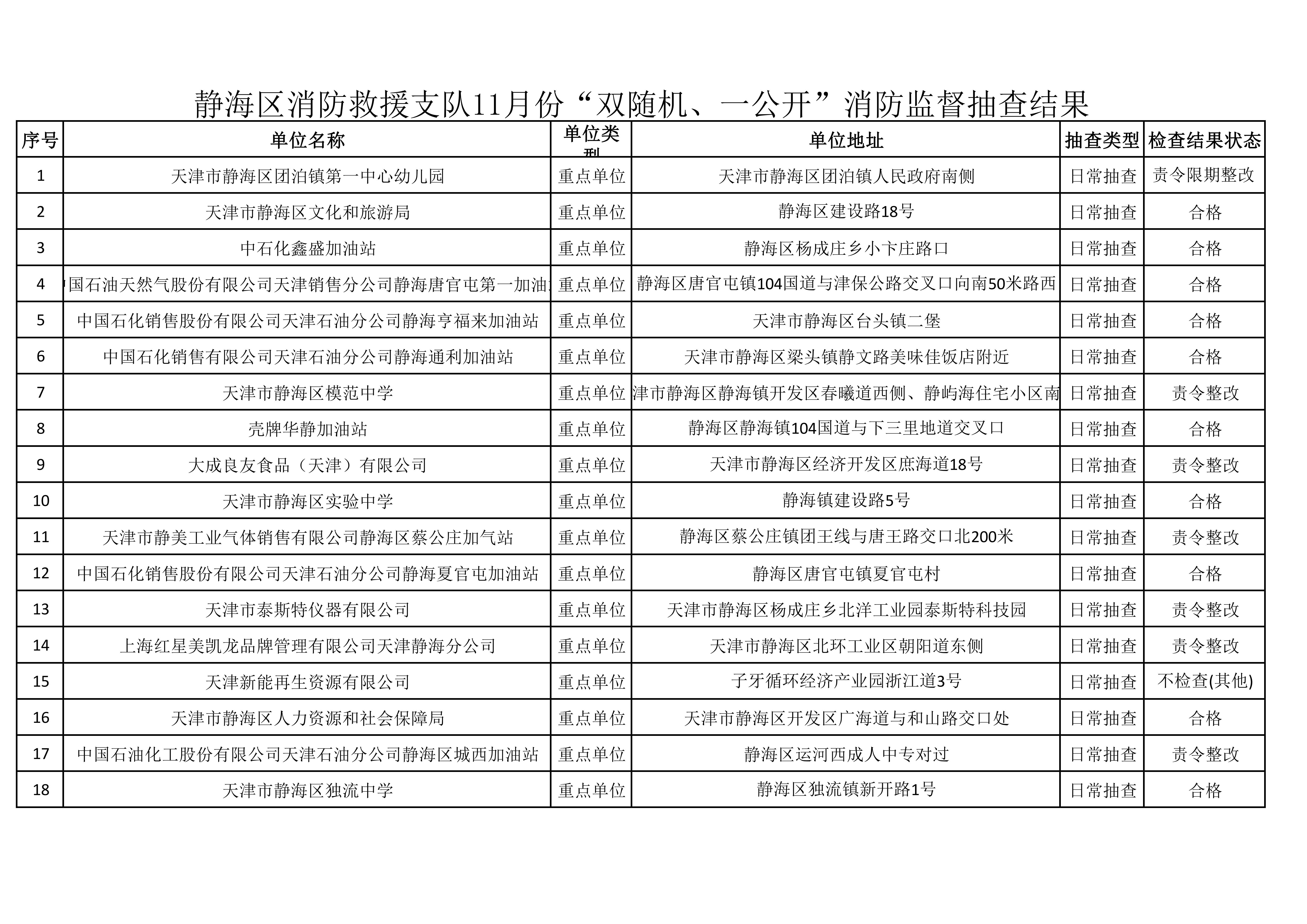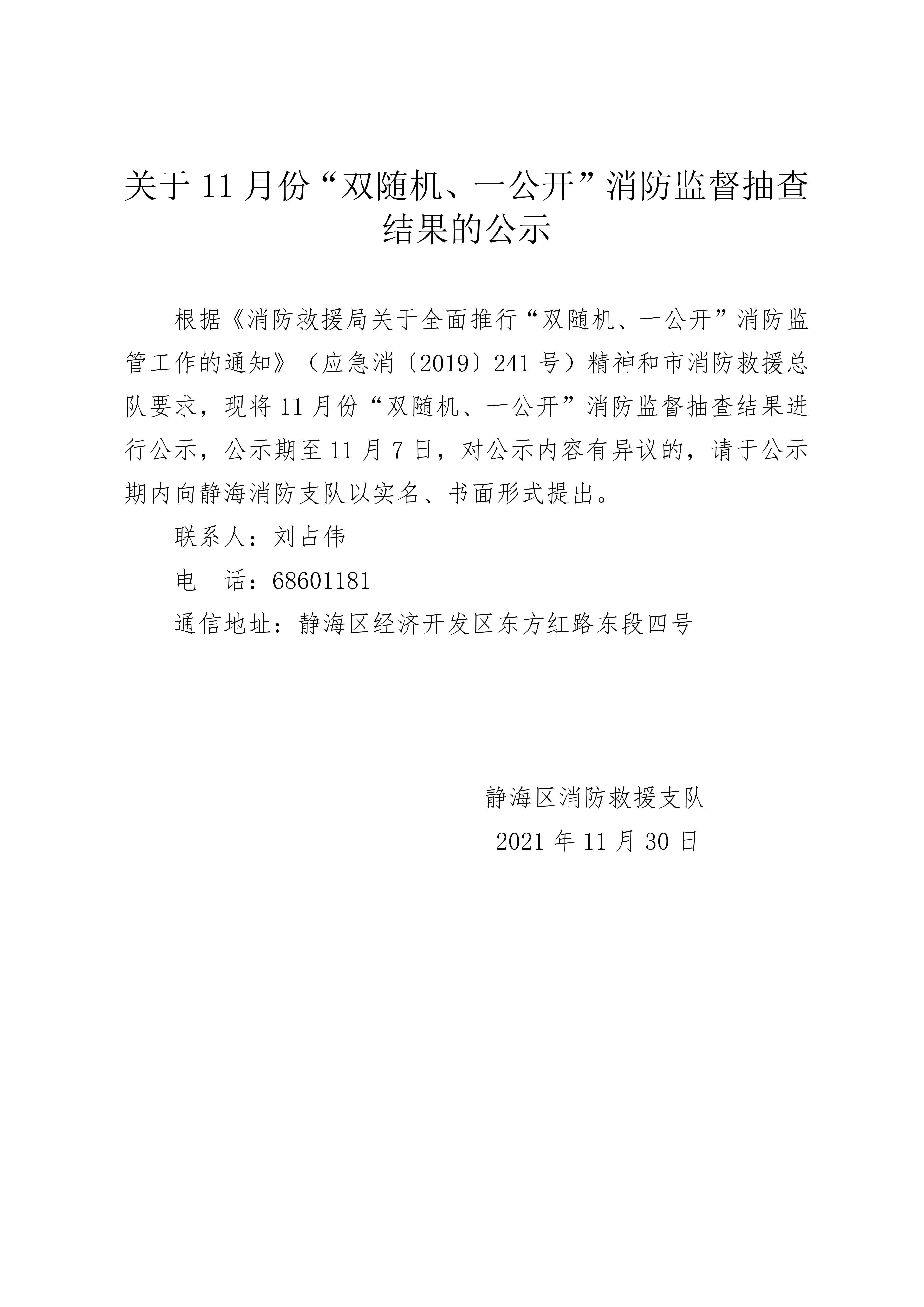 关于2021年11月份“双随机、一公开”消防监督抽查结果的公示