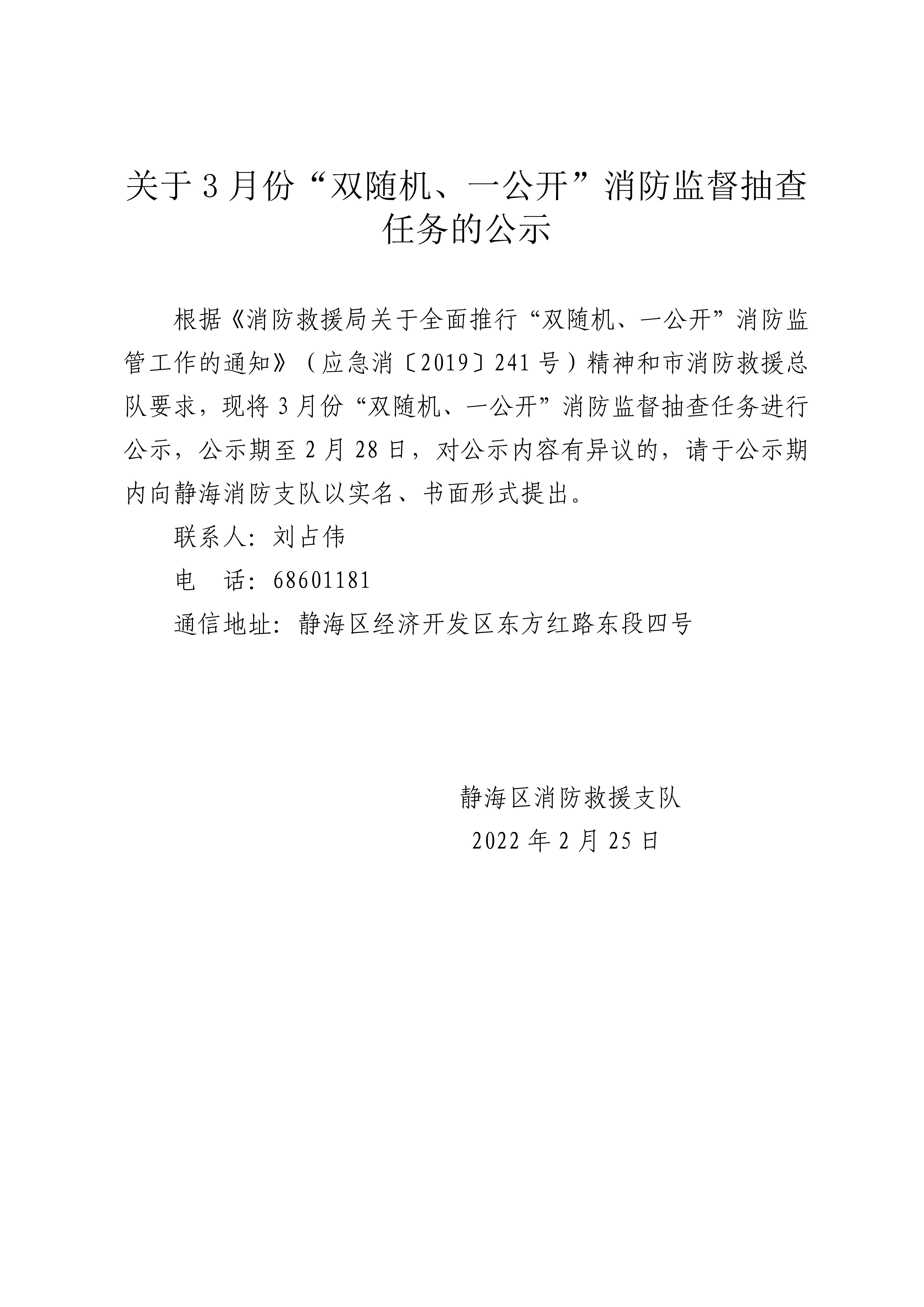 关于3月份“双随机、一公开”消防监督抽查任务的公示