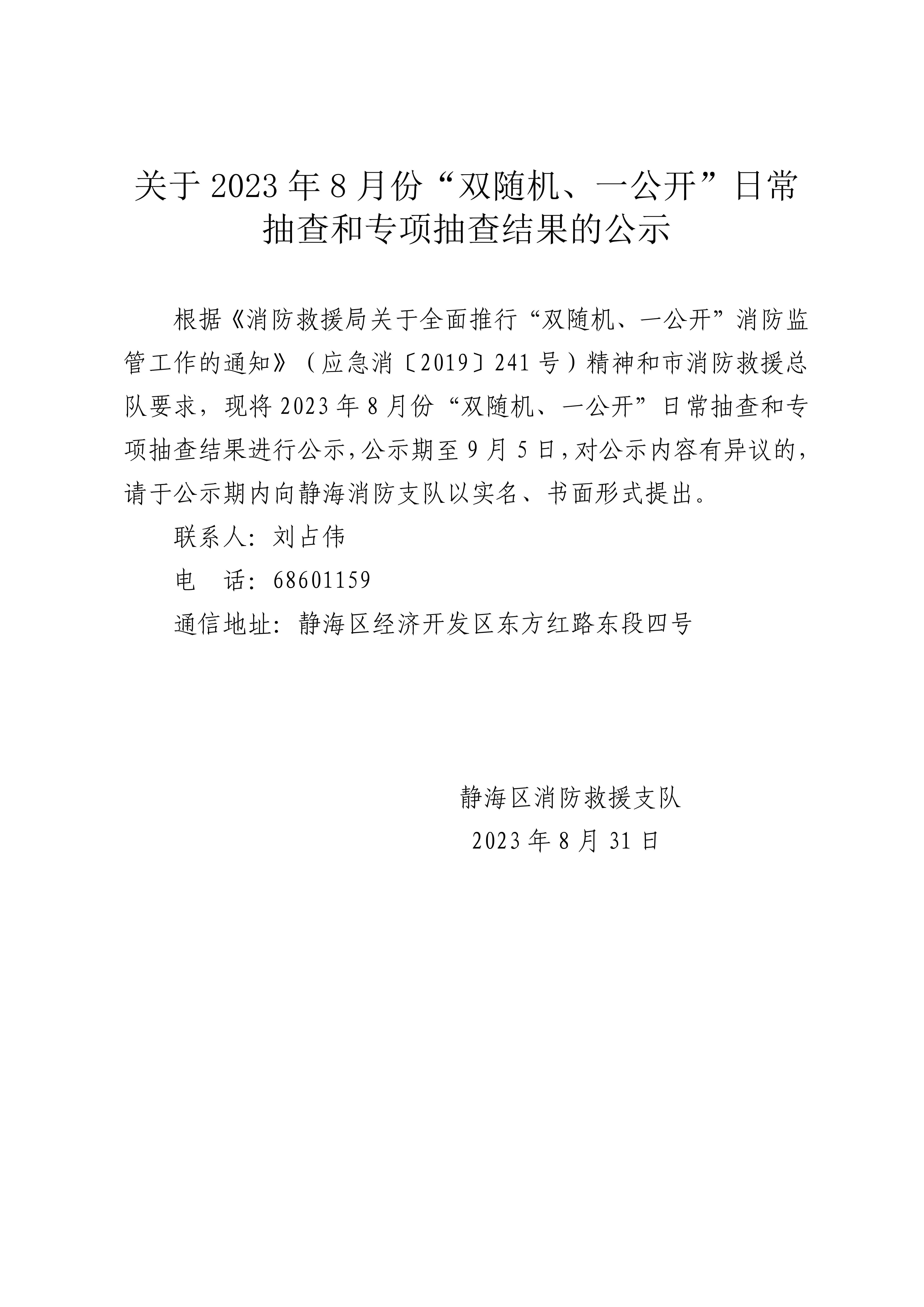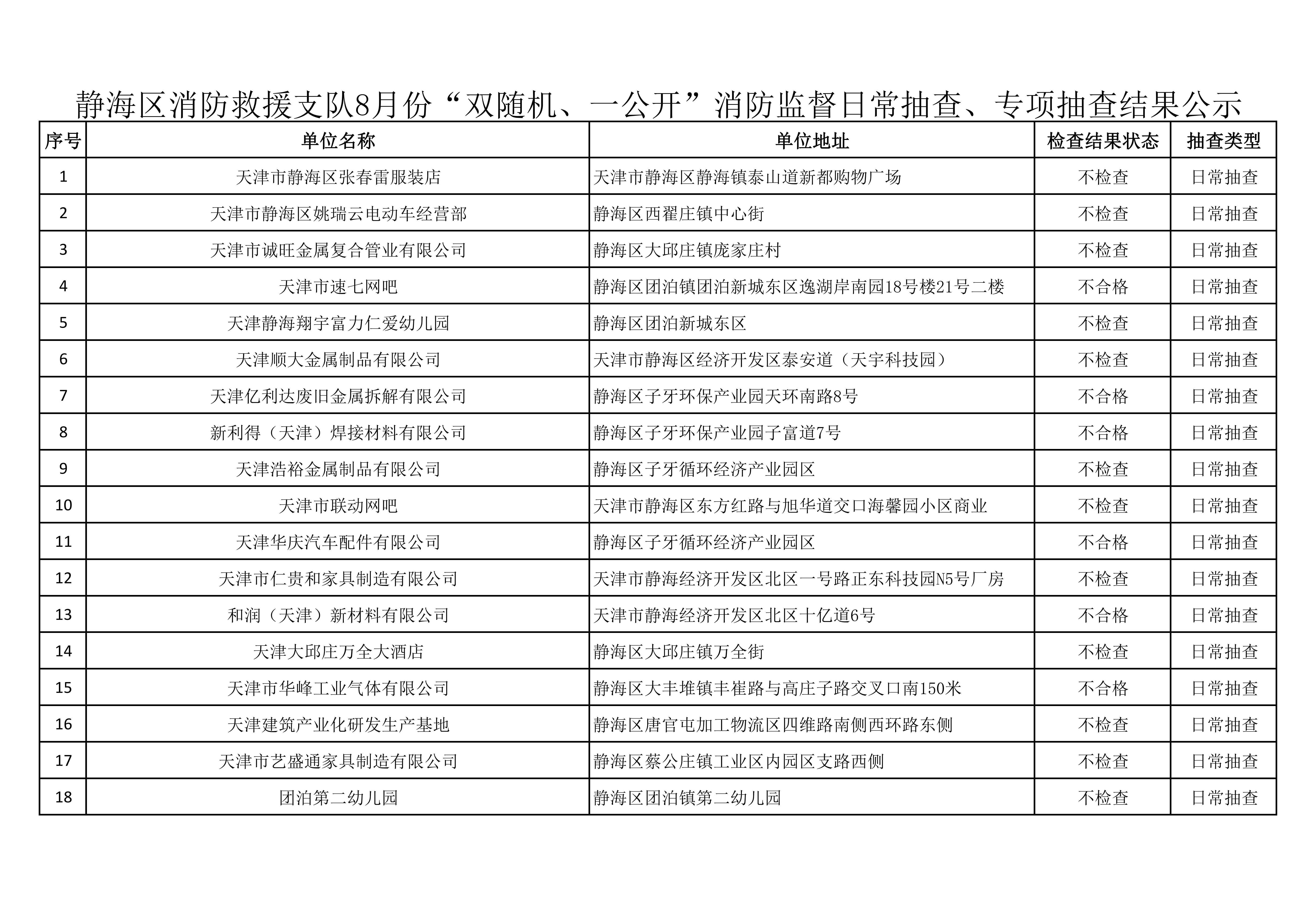 关于8月份“双随机、一公开”消防监督日常抽查、专项抽查结果的公示