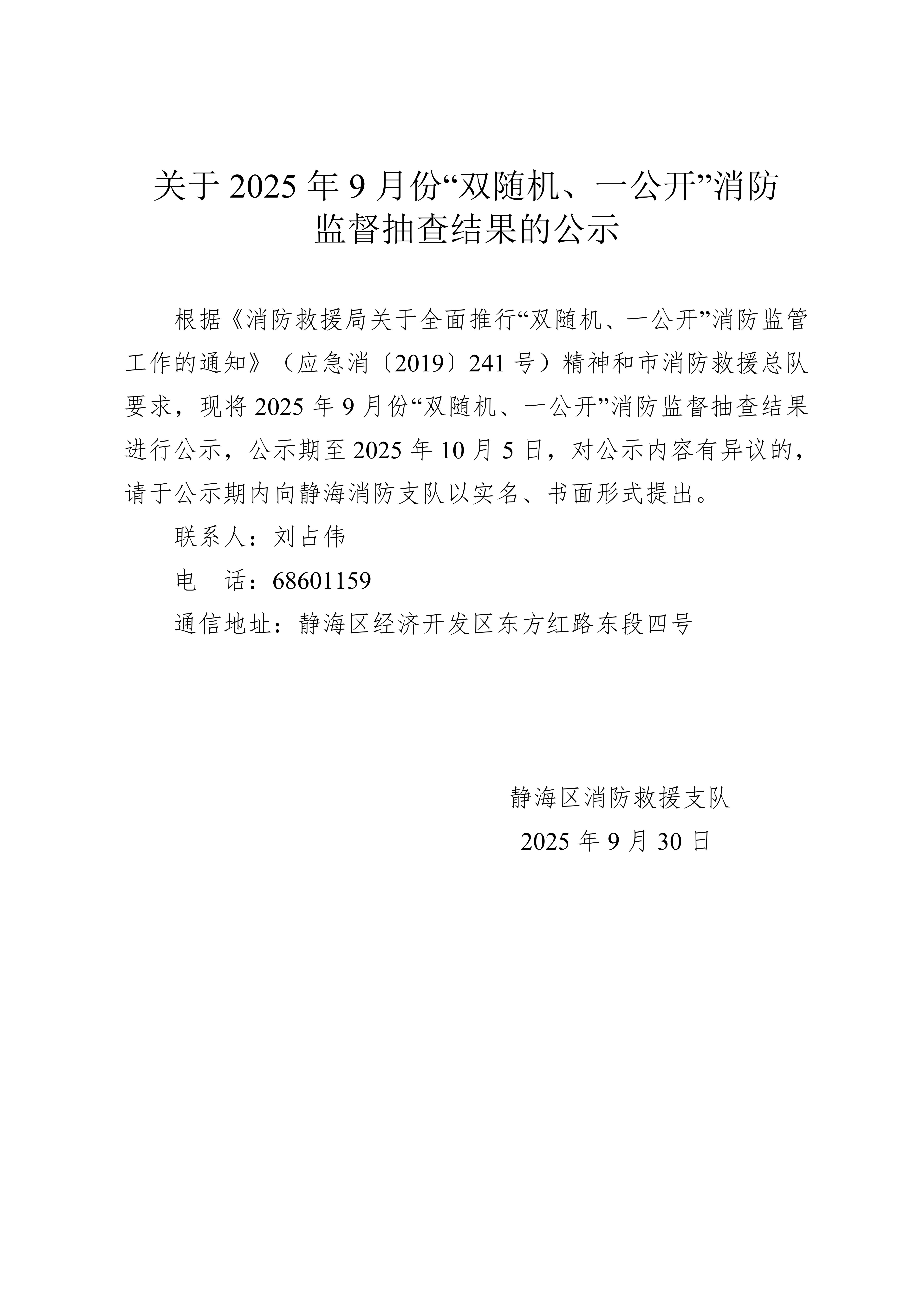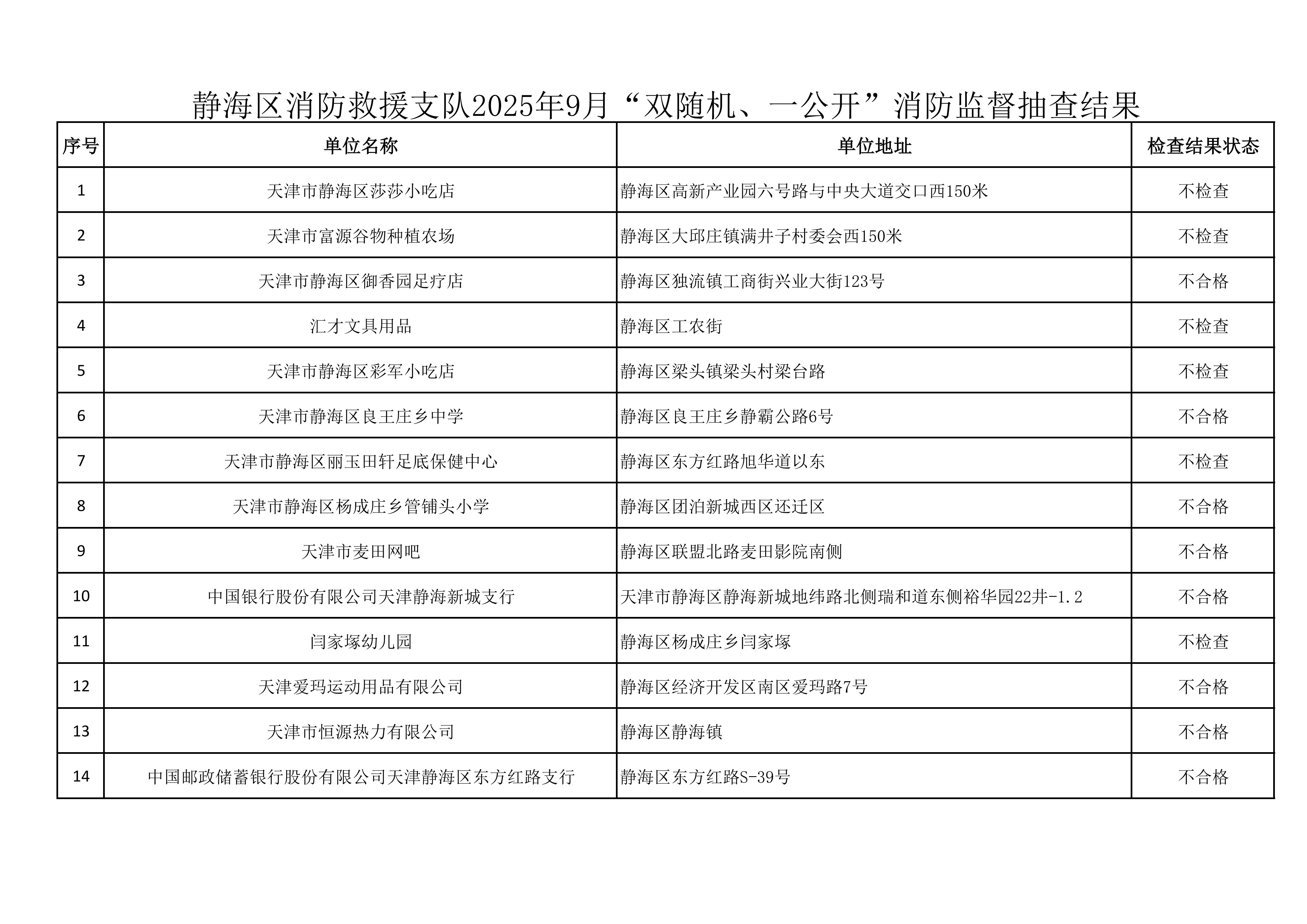 关于9月份“双随机、一公开”消防 监督抽查结果的公示