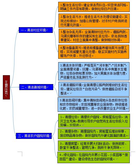 总体目标:“村两委”换届完成后,集中力量在农村全域实施清洁化工程,解决农村环境“脏乱差臭”等突出问题,实现“三无、三有、三覆盖”的目标,即:河道水系无杂物,公路两侧无垃圾堆,公厕无粪便污水外溢;垃圾有效管控,污水有效收集,畜禽散养有效治理;村庄保洁队伍全覆盖,村镇垃圾收运设施设备全覆盖,村庄网格化长效管护机制全覆盖。
