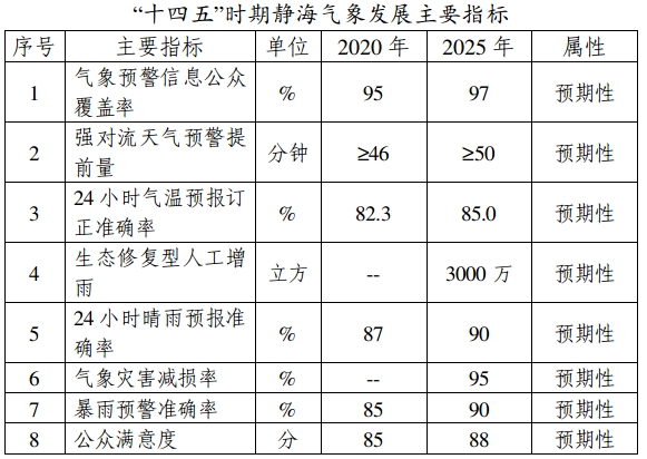 到2025年,初步实现具备气象监测精密、气象预报精准、气象服务精细、气象科技创新为特征的现代化气象业务体系、服务体系、科技创新体系、气象综合防灾减灾体系。灾害性天气预警平均提前量大于等于50分钟、气象预警信息公众覆盖率达97%以上,气象服务保障民生能力显著提升,发挥气象防灾减灾第一道防线作用;气象服务保障生态治理与乡村振兴能力显著提升,应对气候变化、环境健康气象、生态修复型人工增雨、都市型农业气象保障能力明显提高;提升气象服务能力融入区委区政府建设“六个静海”远景目标,加强都市气象、农业气象、交通气象、生态气象等智慧气象服务能力,为静海乡村建设、经济发展、互联互通、生态环境、智慧城市等重点工作的完成提供有力支撑。