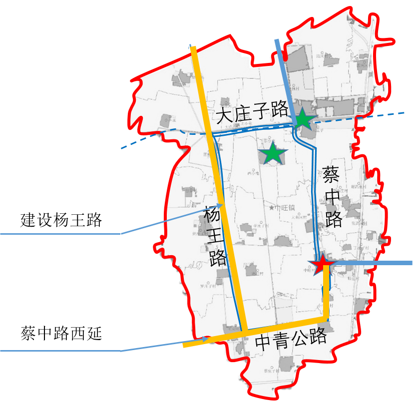 ——主干道整治。以交通性功能为原则,完成杨王路、蔡中路西延等道路建设,突出出行机动化、快速及高效的整治特点;道路路面铺装材质采用水泥或沥青饰面铺装;道路纵坡、承载力满足机动车需求。完善镇内全域道路通达性和公交站点建设,实现整个中旺镇全域“快进漫游”的交通体系。
