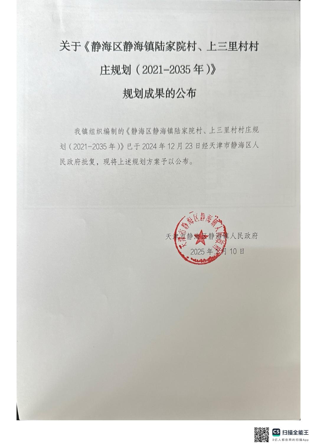 关于《博彩365 静海镇陆家院村、上三里村村庄规划(2021-2035年)》规划成果的公布