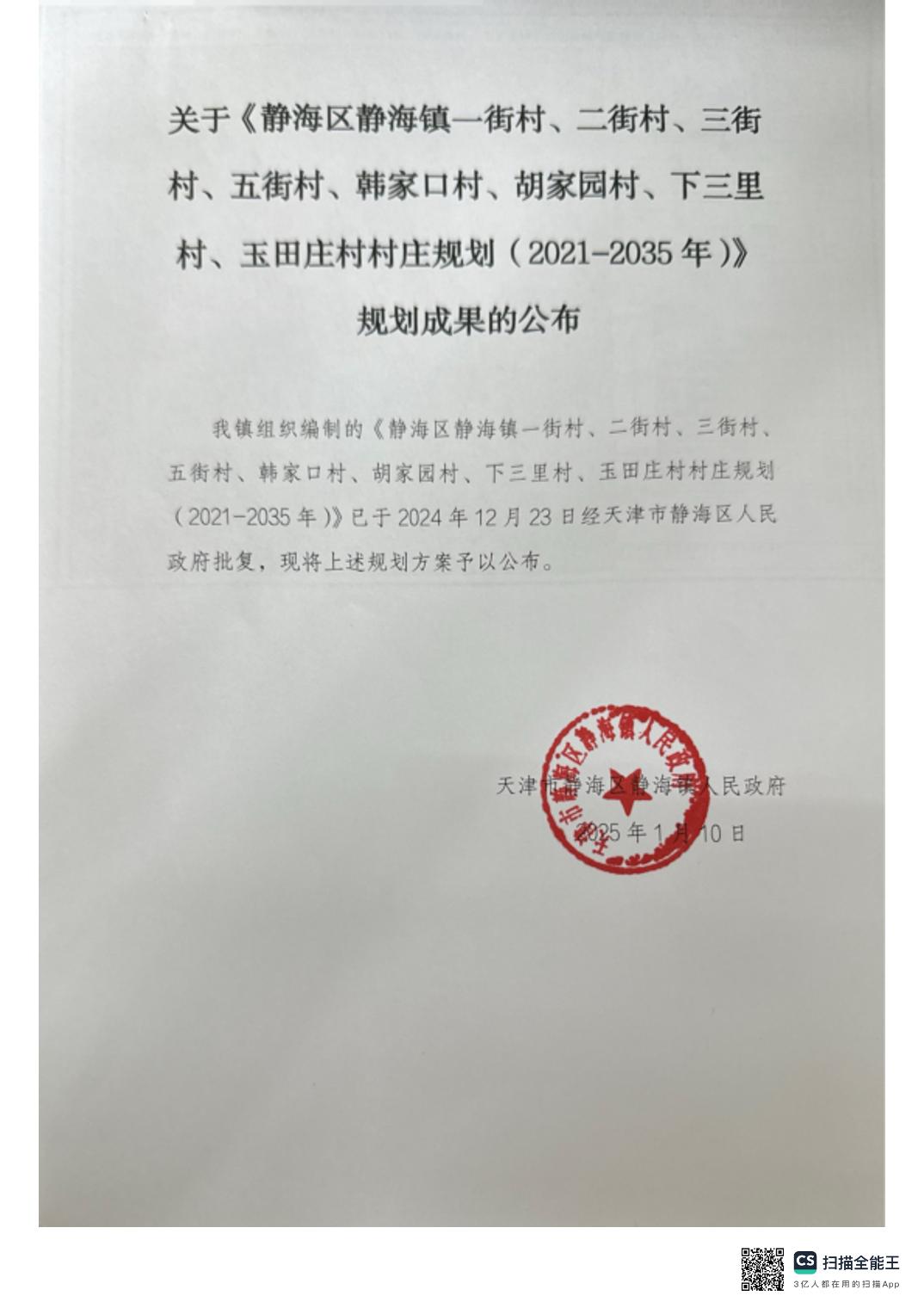 关于《博彩365 静海镇一街村、二街村、三街村、五街村、韩家口村、胡家园村、下三里村、玉田庄村村庄规划(2021-2035年)》规划成果的公布