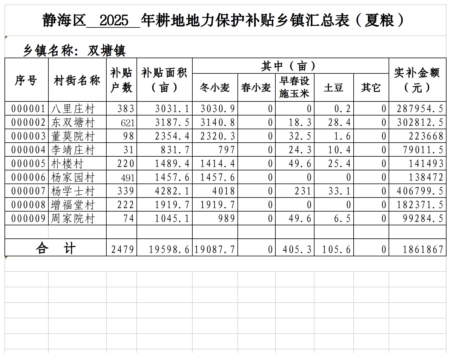 博彩365 双塘镇2025 年耕地地力保护补贴乡镇汇总表(夏粮)