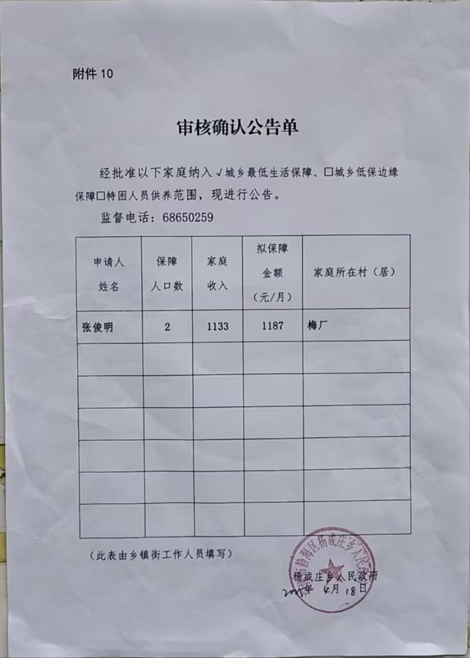 杨成庄乡4月低保审核确认公告单