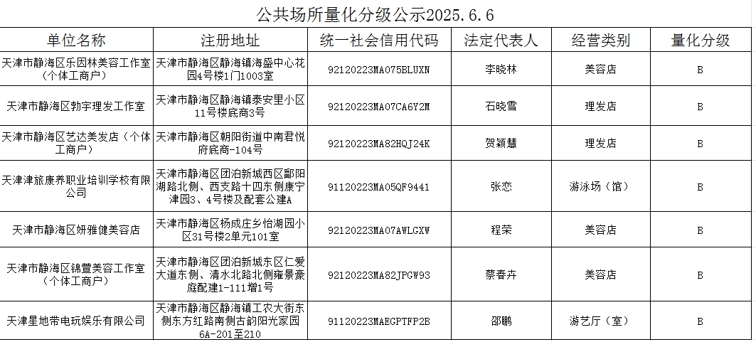 公共场所量化分级公示2025.6.6