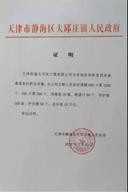 天津恒盛达市政工程有限公司张亚茹先生捐赠口罩1700个、消毒液18
