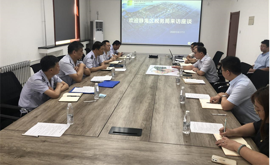 为更好地开展生态城招商引资工作、服务入园企业,2020年8月7日上午,管理局邀请区税务局副局长刘炳祥、大邱庄镇税务所所长孙景坤一行来我局座谈交流,管理局局长刘文闯,副局长孟庆欣、段然,以及经济发展部、计划财务部参加本次座谈。