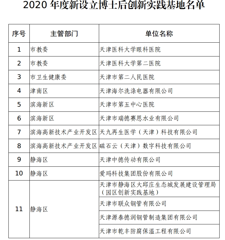 为贯彻落实“海河英才”行动计划,进一步发挥博士后工作对我市高质量发展的支撑作用,推动产学研深度融合,优化博士后设站单位布局,市人社局于2020年11月开展天津市博士后创新实践基地申报工作。中德生态城管理局联合天津市联众钢管有限公司、天津源泰德润钢管制造集团有限公司、天津市乾丰防腐保温工程有限公司共同申报博士后园区创新实践基地,并于2021年5月7日成功获批,为未来高水平人才提供科研和工作平台。