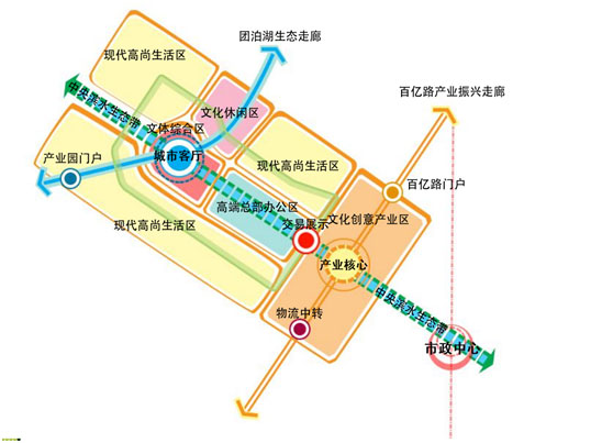 根据目前区域内产业现状,结合生态自然系统,中德天津大邱庄生态城的核心,强化其聚集效应,规划“一心、一轴、两廊、三片区”的结构布局,形成从文化到生态,从城市到自然的复合空间 。